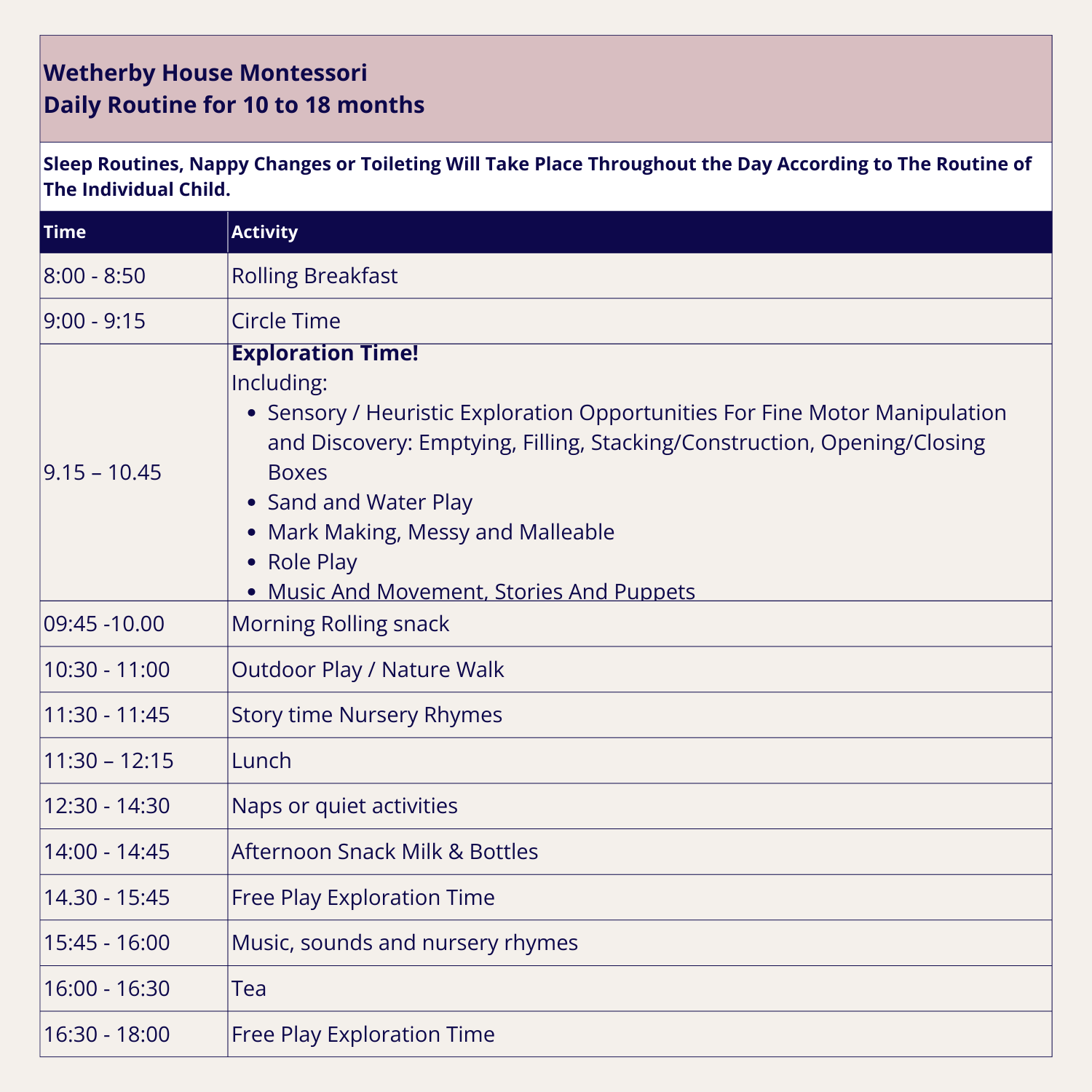 Babies in this room are also exposed to well-planned activities and sensory resources, as they develop naturally through discovery and play. Activities like sand, water, messy play, and treasure baskets are accessible throughout the day.